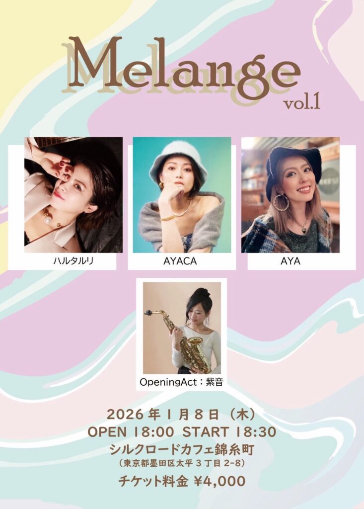 news bio disco live photo goods salon contact LIVE 【錦糸町】Melange vol.1 ・日時: 2026年1月8日(木) OPEN 18:00 START 18:30 ・出演: ハルタルリ / AYACA / AYA / 紫音(O.A.) ・会場: シルクロードカフェ錦糸町 東京都墨田区太平3丁目2-8 会場サイト会場サイト ・料金:4,000円 ご予約はこちら → ← Back